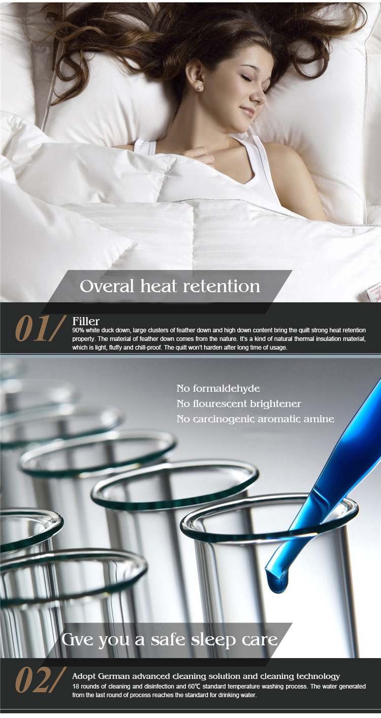 Superior Weight Super Soft Wrinkle Resistant Duvet Cover. Selected healthy and quality white duck down can increase the softness and comfort of quilt, enable it keep warm, dry and clean all the time so as to give you a good sleep.