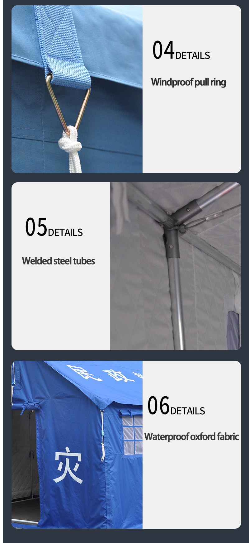 This emergency tent is widely applied in emergency relief efforts when natural disasters strike, providing immediate shelter for the affected. The military uses it to set up field camps quickly, and it serves as a crucial temporary medical facility for medical teams. It's also a staple in UN donations, government - stockpiled emergency goods, and Red Cross operations. With easy - to - assemble features, it can be set up rapidly even under pressure. You can choose from a rich palette of colors to meet different needs. Made of high - quality, durable materials, it withstands extreme weather. Its lightweight design ensures convenient transportation and storage, making it the perfect choice for various emergency scenarios. |