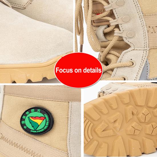 Forest Fire Boots Kevlar Midsole Puncture-ResistantThese sand-colored forest firefighting boots feature impact and puncture-resistant design, specifically engineered for quick rescue operations. The high-top structure provides comprehensive ankle protection, enhances stability, and reduces sprain risk. The heat-resistant outer layer effectively withstands high-temperature environments, ensuring the safety of rescue personnel's feet. Particularly suitable for forest fire suppression, woodland rescue, and complex terrain disaster relief operations, providing reliable protection for forest firefighters, helping to complete rescue tasks quickly and efficiently, ensuring operational safety and emergency response efficiency in critical situations.