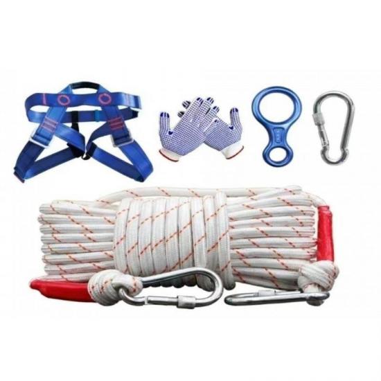 This Fire Safety Rope Set is specially designed for building fire escape, featuring high-temperature resistant steel-core nylon structure with a single rope bearing capacity of 800kg, equipped with 8-piece professional escape gear. The set includes main rope, safety harness, descender, speed controller, anti-cutting gloves and other key components to meet emergency evacuation needs in high-rise building fires. The 20-meter rope is suitable for buildings under 8 floors, with all equipment passing national fire equipment testing standards, providing a reliable life passage for residences, office buildings, schools and other venues, making it essential home fire safety equipment.