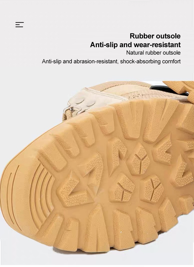 These sand-colored firefighting tactical boots combine military-grade flame-retardant canvas with natural rubber, featuring impact-resistant, puncture-proof, and explosion-proof design. The 24cm high-top fully protects ankles. Professionally tested to FR fire rating with a 0.89 slip coefficient, each boot weighs only 860g. The hexagonal rubber sole provides 99% terrain adaptability, ideal for forest firefighting, earthquake rescue, and special operations in high-risk environments, offering excellent protection for professional rescue teams.