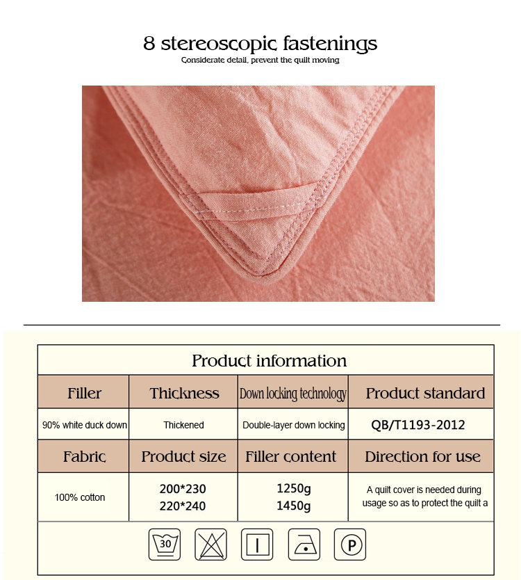 Superior Weight Super Soft Wrinkle Resistant Duvet Cover. Selected healthy and quality white duck down can increase the softness and comfort of quilt, enable it keep warm, dry and clean all the time so as to give you a good sleep.