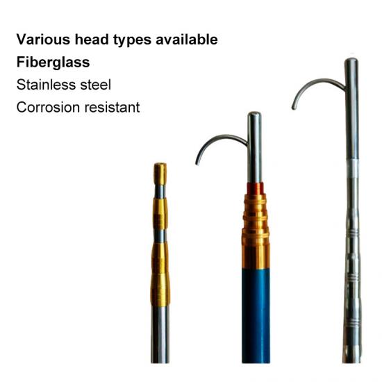 Pole body available in 201 stainless steel or fiberglass material, hook made of 201 stainless steel, ring made of aluminum alloy, detachable and foldable |