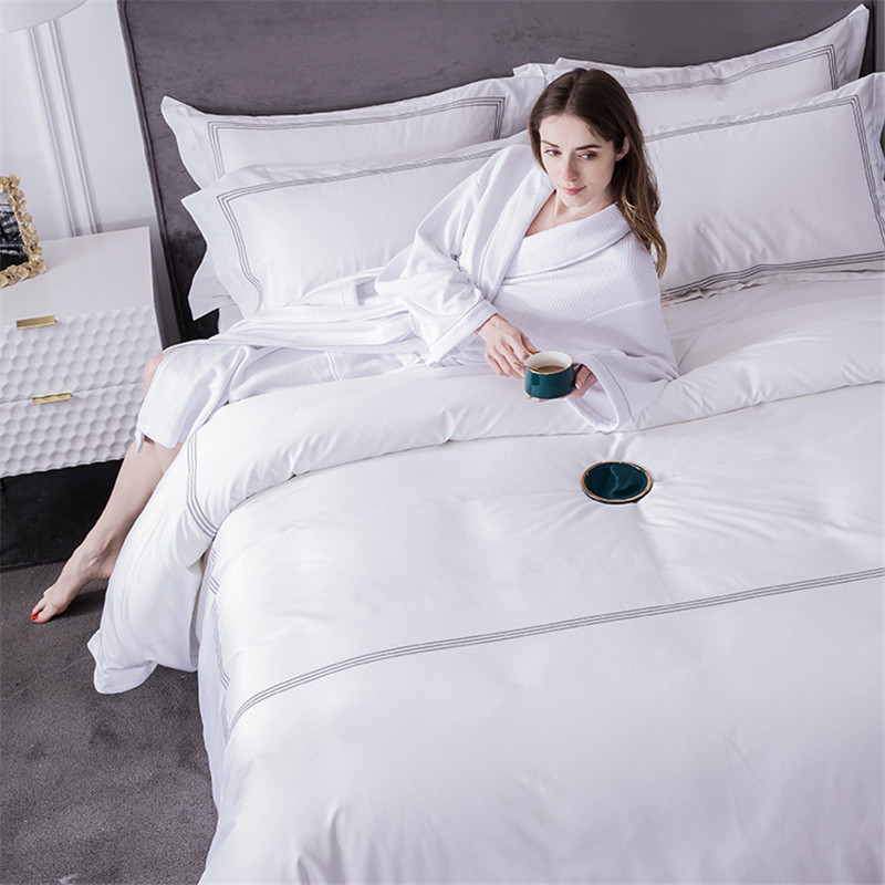 Hello everyone, this is YRF textile manufacturer, please follow me for more hotels. Today, let's talk about how to configure the size of the hotel Duvetbedset,. Usually the length of the Duvetscovers, is 240cm, and the standard size of the width should be hung on both sides of the Duvetbedset, which can cover the splicing gap between the mattress and the bed frame. Let's take a 120 x 200cm bed as an example with a mattress height of 20cm. The width of the bed is 120cm, plus the mattresses on both sides are 40cm, plus the sagging on both sides, which exceeds the splicing of the mattress and the bed frame by 10cm, and the two sides add up to 20cm. Divide by the shrinkage of cotton products 0.95. The Duvetscovers, is about 190cm wide. do you understand?