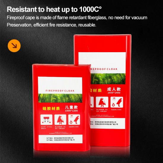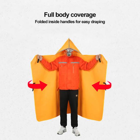 1000°C Heat-Resistant Fire Cape, Emergency Escape EssentialThis orange fire protection cape is made of heat-resistant fiberglass with double-sided silicone coating, withstanding temperatures up to 1000°C, with material thickness ≥0.425mm. Adult size 1.6m×1.2m, children's size 1.2m×1.0m. Back reflective strips design increases visibility by 97% at night or in smoke environments. Full-body protection with drawstring closure effectively isolates high temperatures during fire rescue and escape, providing professional protection for petrochemical plants, high-rise fires, and industrial fire escapes, extending escape time by 3-5 minutes.