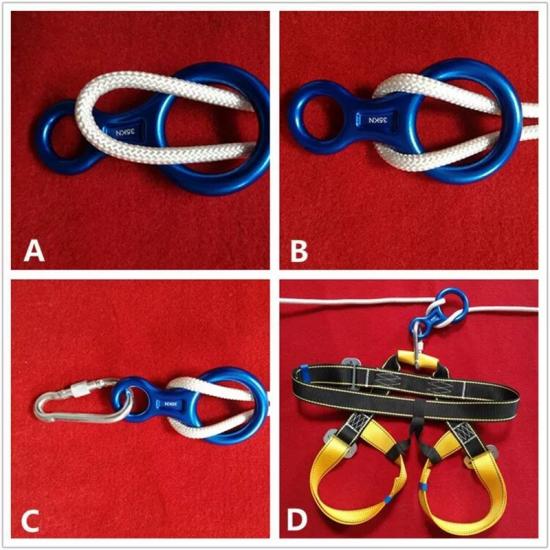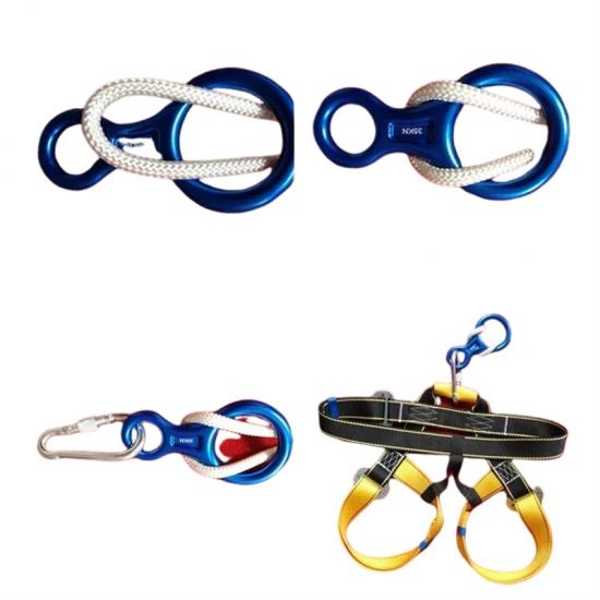 A: The blue figure-8 is a professional descent control device, precisely controlling descent speed at 1.2m/s through friction, preventing rapid falls.