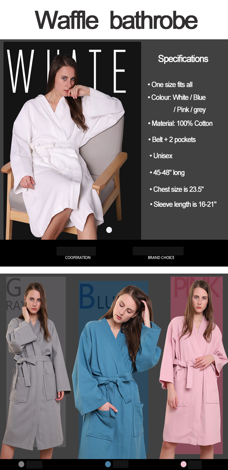absorption. Double needle sewing, durable. Waffle gowns can be used for bathing, spa, shower, swimming pool and tourism.