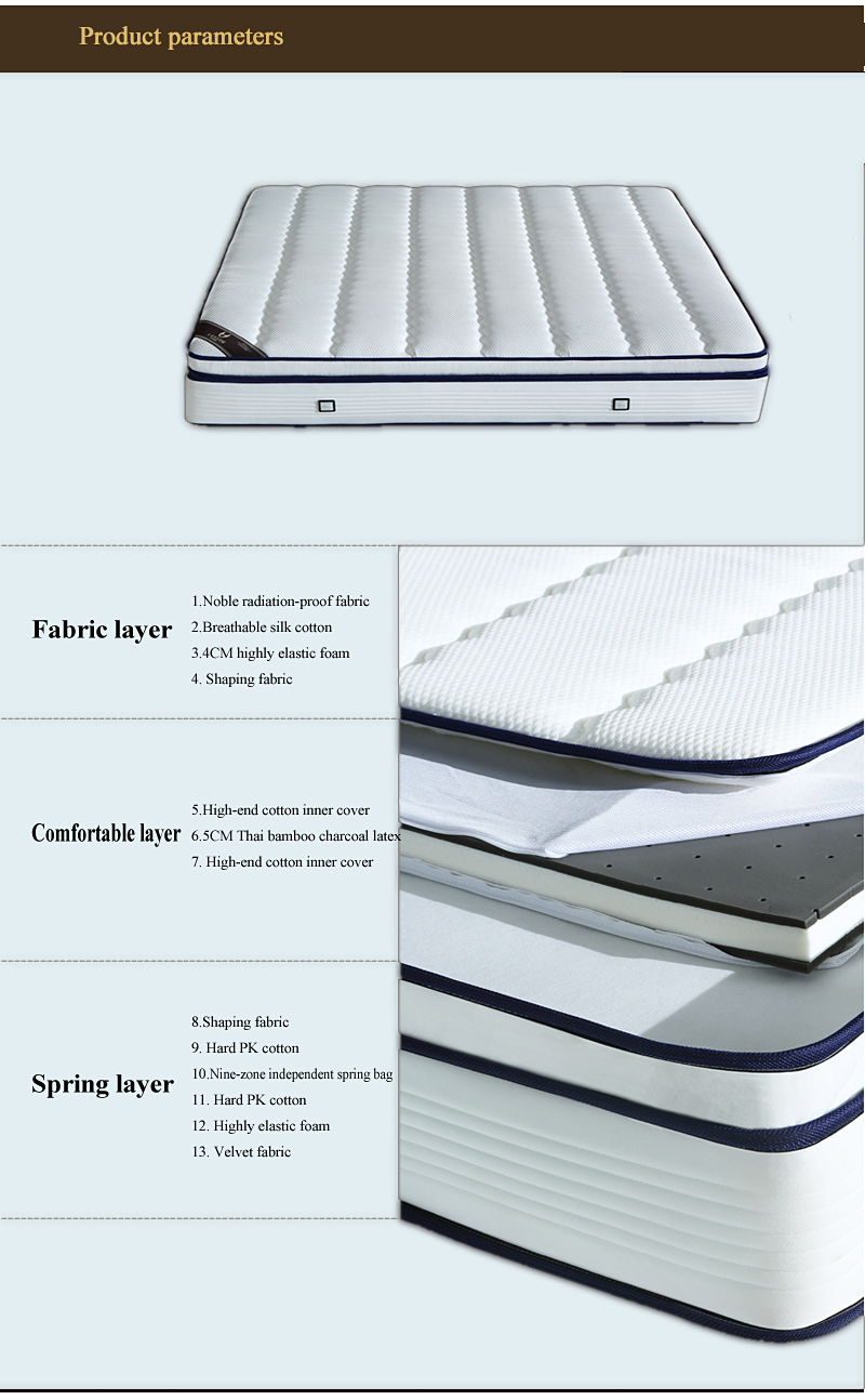 Comfortable and soft touch,With the combination of nine-zone independent spring bag structure and 5CM bamboo charcoal latex, the mattress can completely fit the curve of human body, so that the body can achieve a completely relaxed state.