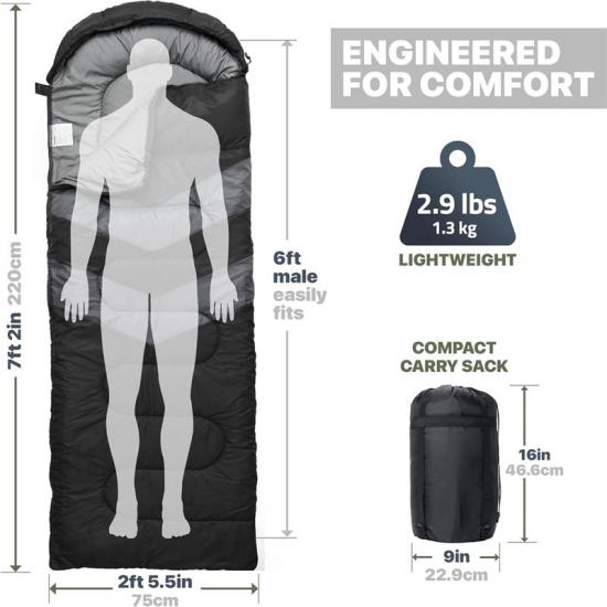 The inside of the sleeping bag is filled with 3D inner synthetic fibers to provide optimal warmth and insulation. Suitable for spring, summer, fall and cooler weather, the sleeping bag is rated for temperatures from 40°F to 77°F, with an optimal comfort temperature of 62°F to 75°F.