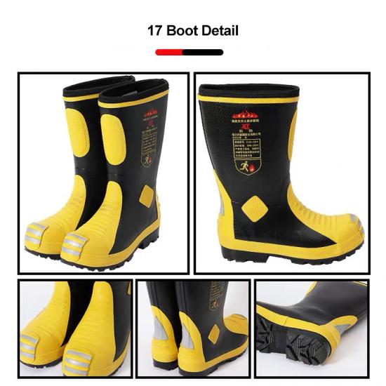 Professional firefighter rescue boots with flame-resistant waterproof rubber shell, puncture resistance exceeding 1100N, impact protection >200N, maintaining internal temperature <22°C under 150°C heat test. Black rubber with bright yellow accents, 30cm high design protects calves, weight <3kg doesn't limit mobility. Ideal for urban firefighting, forest fires, chemical plant emergencies and high-risk scenarios, providing comprehensive foot protection for firefighters and emergency response personnel.